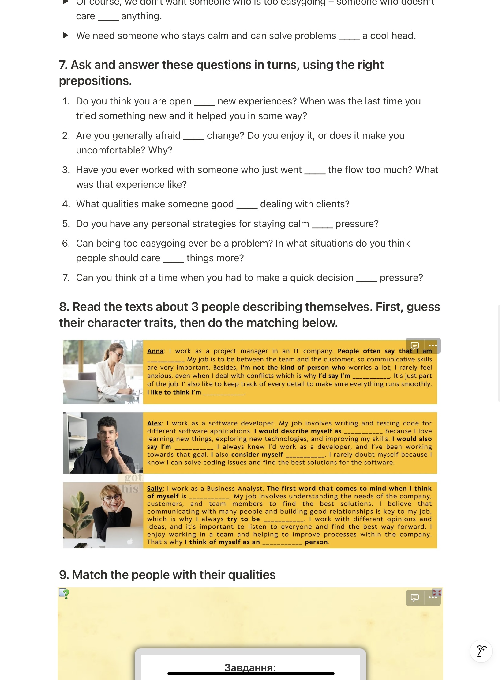 This lesson includes 15 interactive exercises that develop students’ listening comprehension skills in the context of workplace personality traits and hiring practices, and expand their lexical resource through a focus on descriptive adjectives and collocations used to talk about personality and behavior.