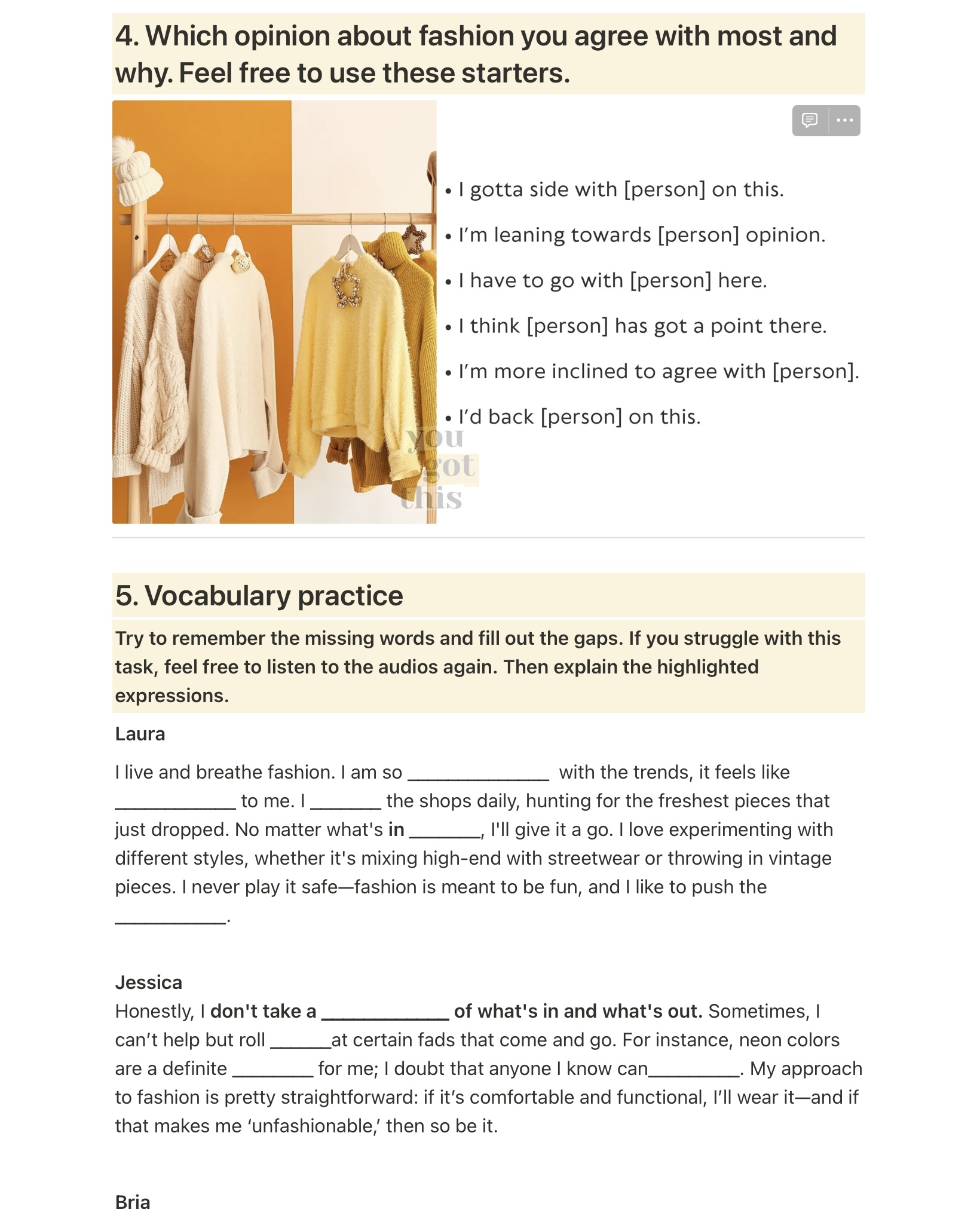 - Learn and practice authentic fashion-related vocabulary and idiomatic expressions.