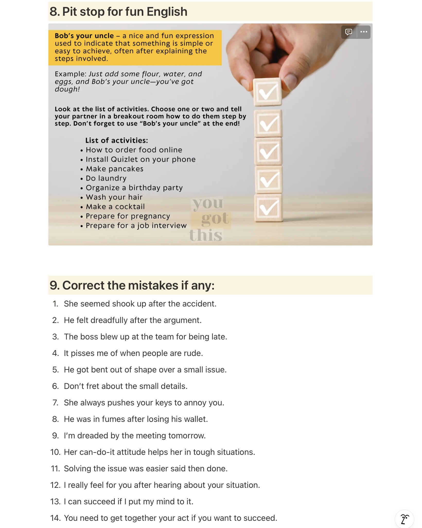 The lesson features 11 interactive exercises to develop students’ speaking fluency and vocabulary range when discussing emotional self-regulation, using idiomatic expressions related to anger and calming down.