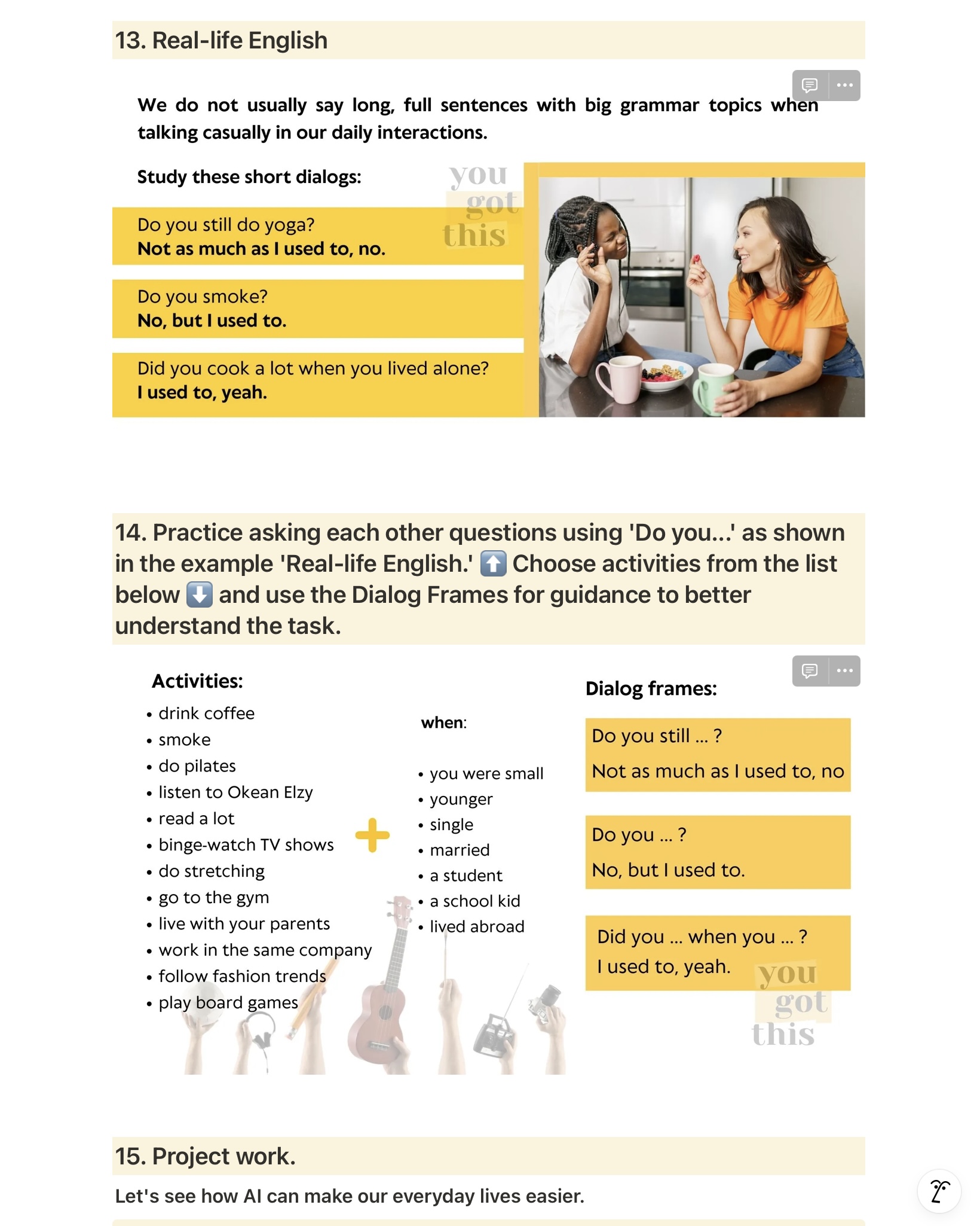 This lesson includes up to 20 exercises, all centered around a single theme, working together in a sequence that provides clarification and practice of the structure “used to” in the context of discussing changes in lifestyle, habits, and the use of AI tools.