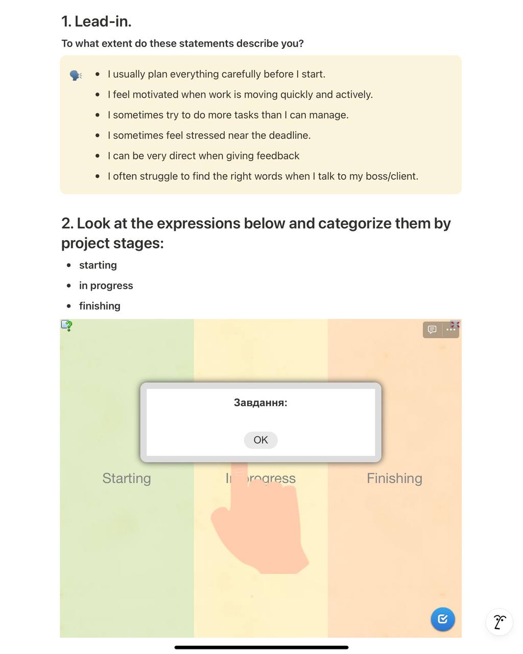This lesson includes up to 20 exercises that develop learners’ ability to understand and use business idioms and expressions related to project work fluently and appropriately in spoken communication.