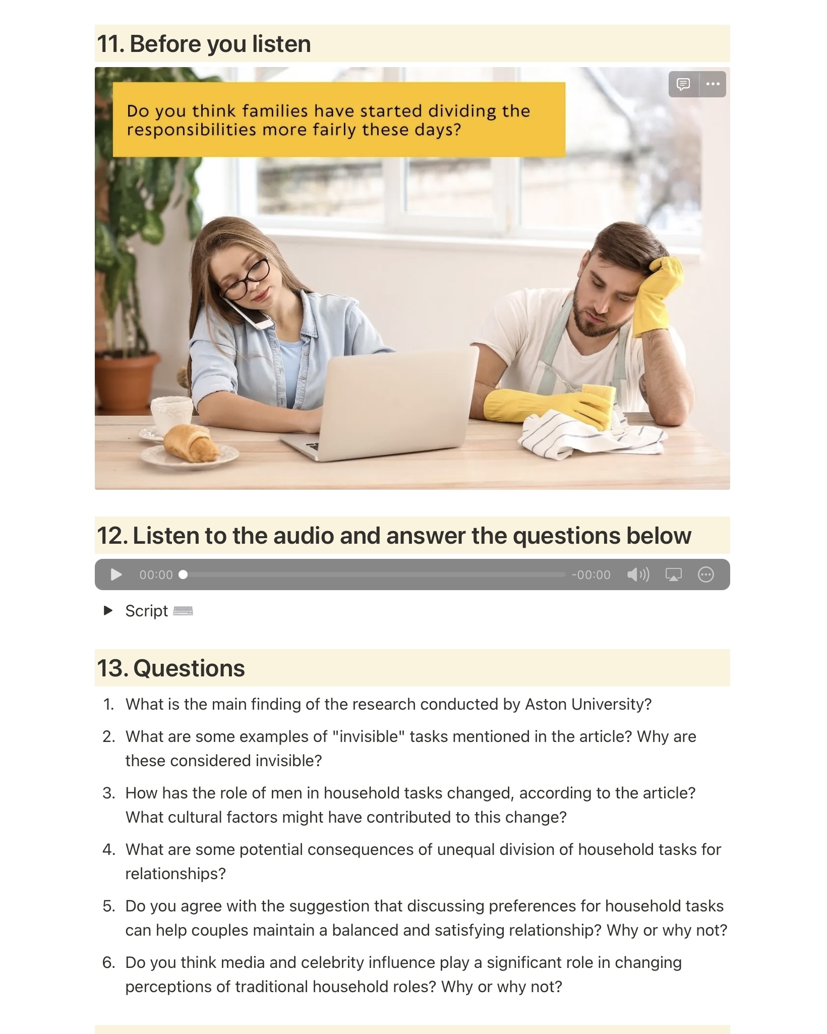 This lesson contains 15+ exercises that develop students’ vocabulary and functional language for talking about household problems, repairs, and chores, and improve fluency in asking for help, describing responsibilities, and discussing shared duties.