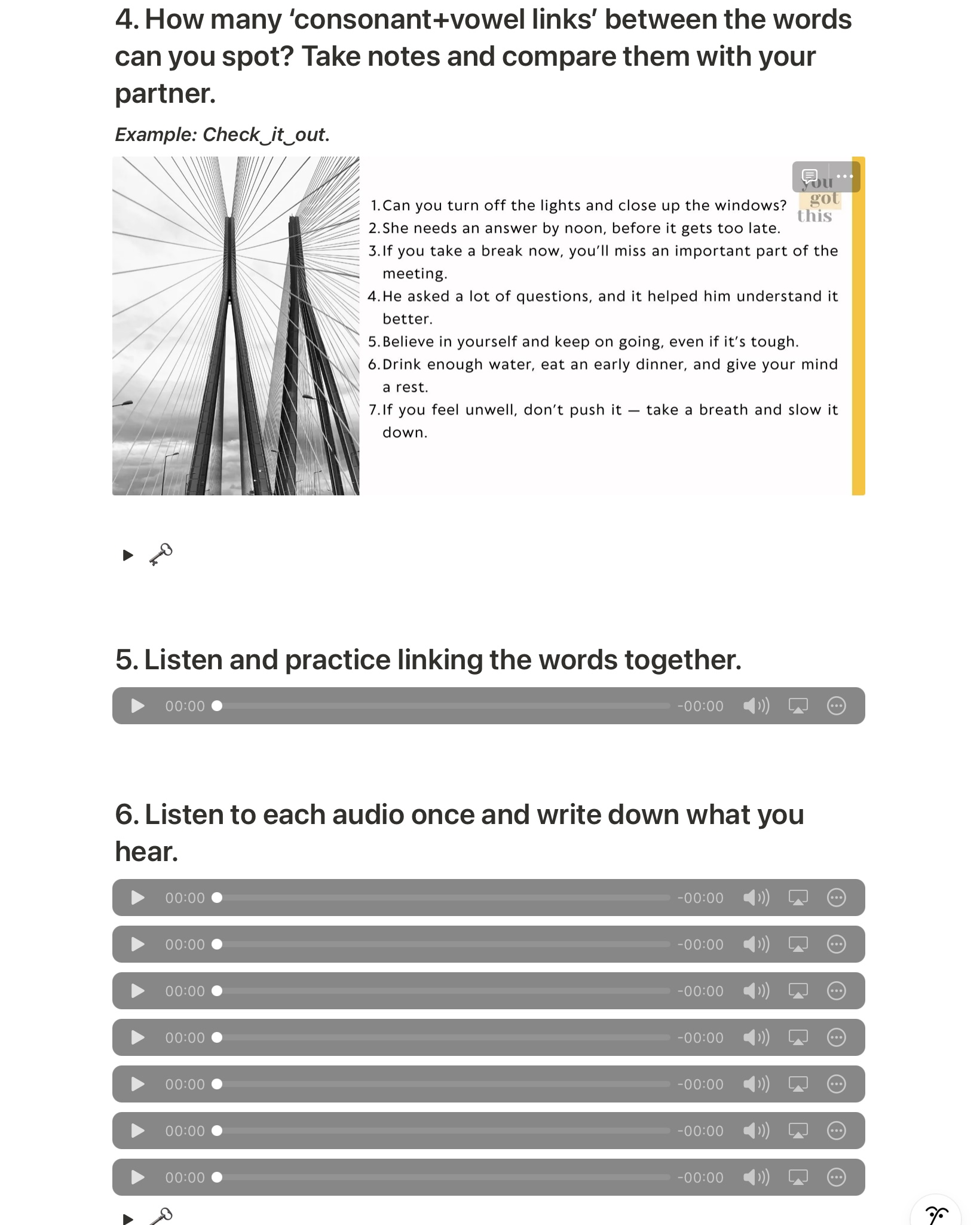 This lesson contains up to 20 interactive exercises that raise awareness of how native speakers connect words in real-life speech, identify and understand catenation, and improve listening skills and decoding ability through audio tasks and guided analysis.