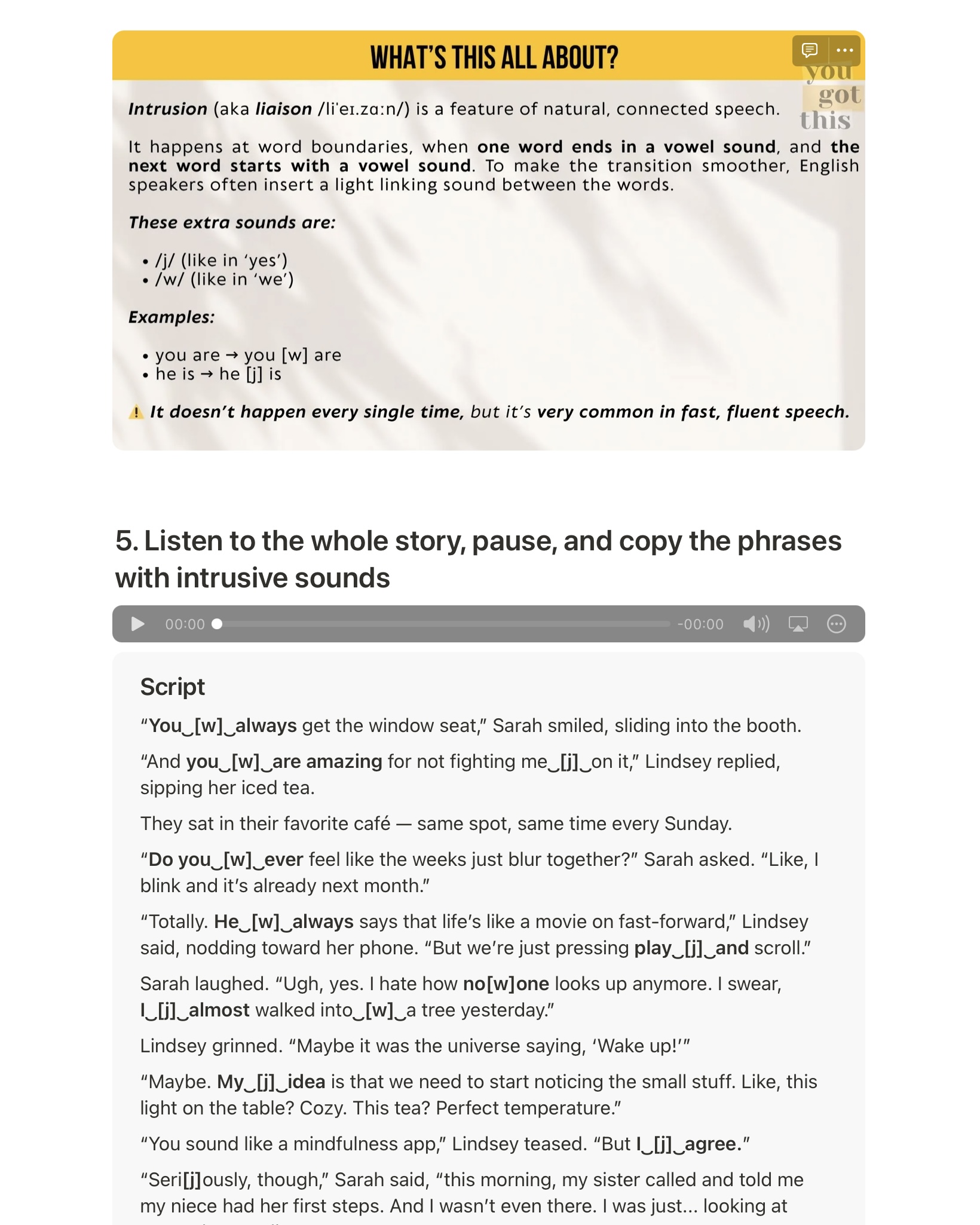This lesson contains 15 exercises to ensure maximum practice and build both awareness and confidence in real-life speech.