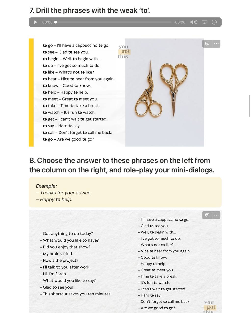 • Learn and practice the weak and strong forms of certain prepositions and articles.