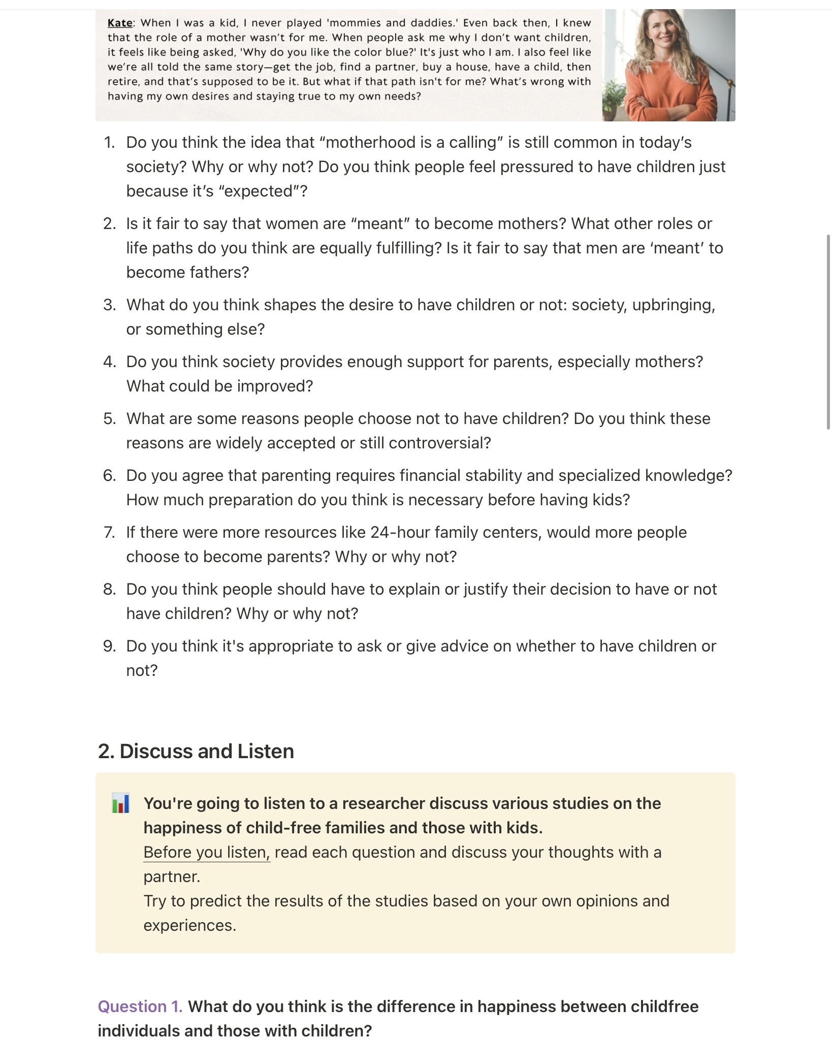 This Speaking Club sparks debates on the choice of having children or staying childfree. With interactive exercises, games, and speaking cards, students explore different perspectives, dilemmas, and surprising facts. Ready to get the conversation flowing? Grab the lesson now!