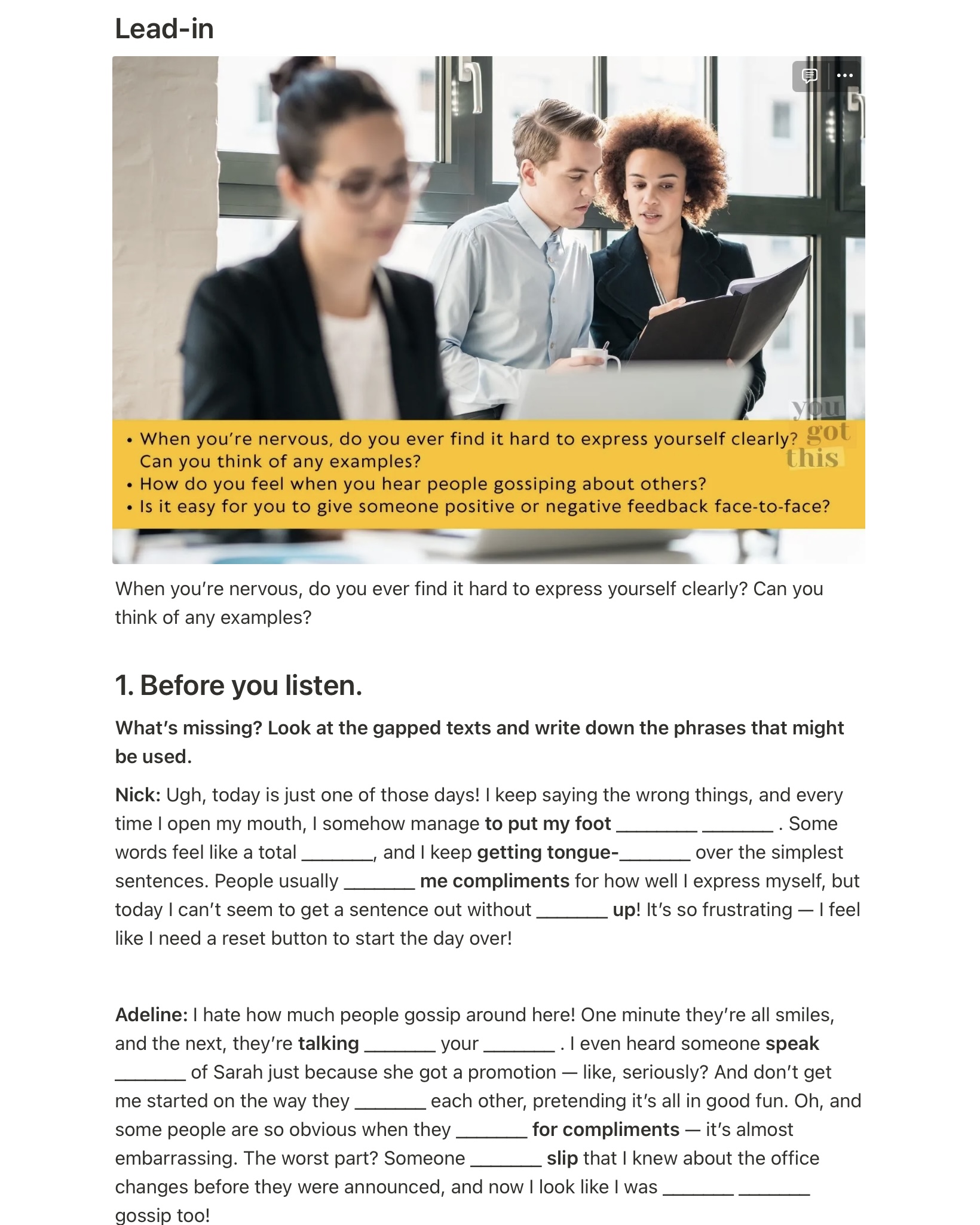 This lesson contains up to 15 interactive exercises that familiarize and help students practice idioms related to communication in context through listening and speaking exercises, and encourage them to use the idioms to describe real-life situations or express personal experiences.