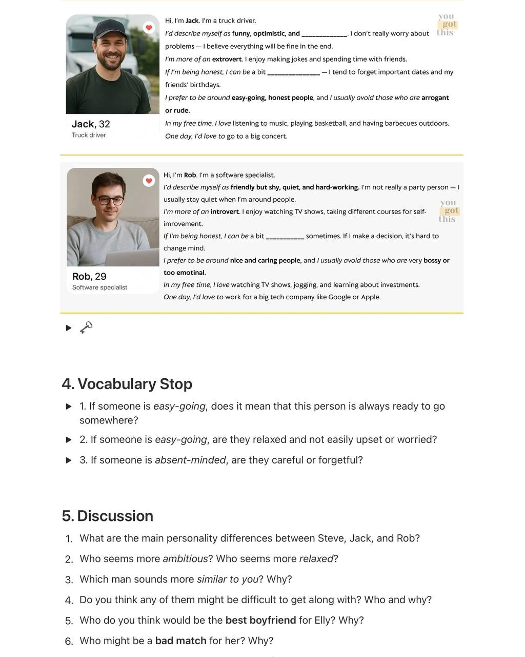 This lesson includes up to 20 exercises that develop students’ ability to describe personality and character naturally in spoken English using common adjectives and follow-up comments.