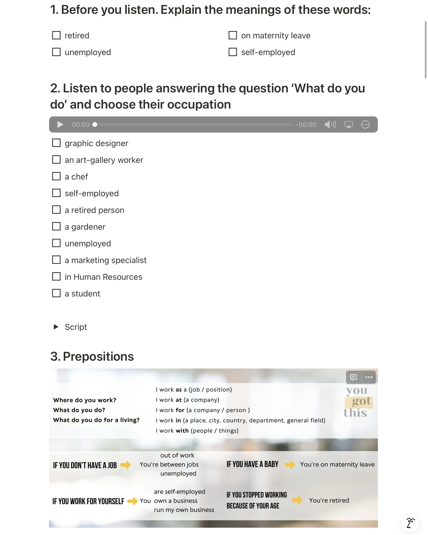 - Discuss job-related vocabulary and clarify the difference between “What do you do?” and “What are you doing?”